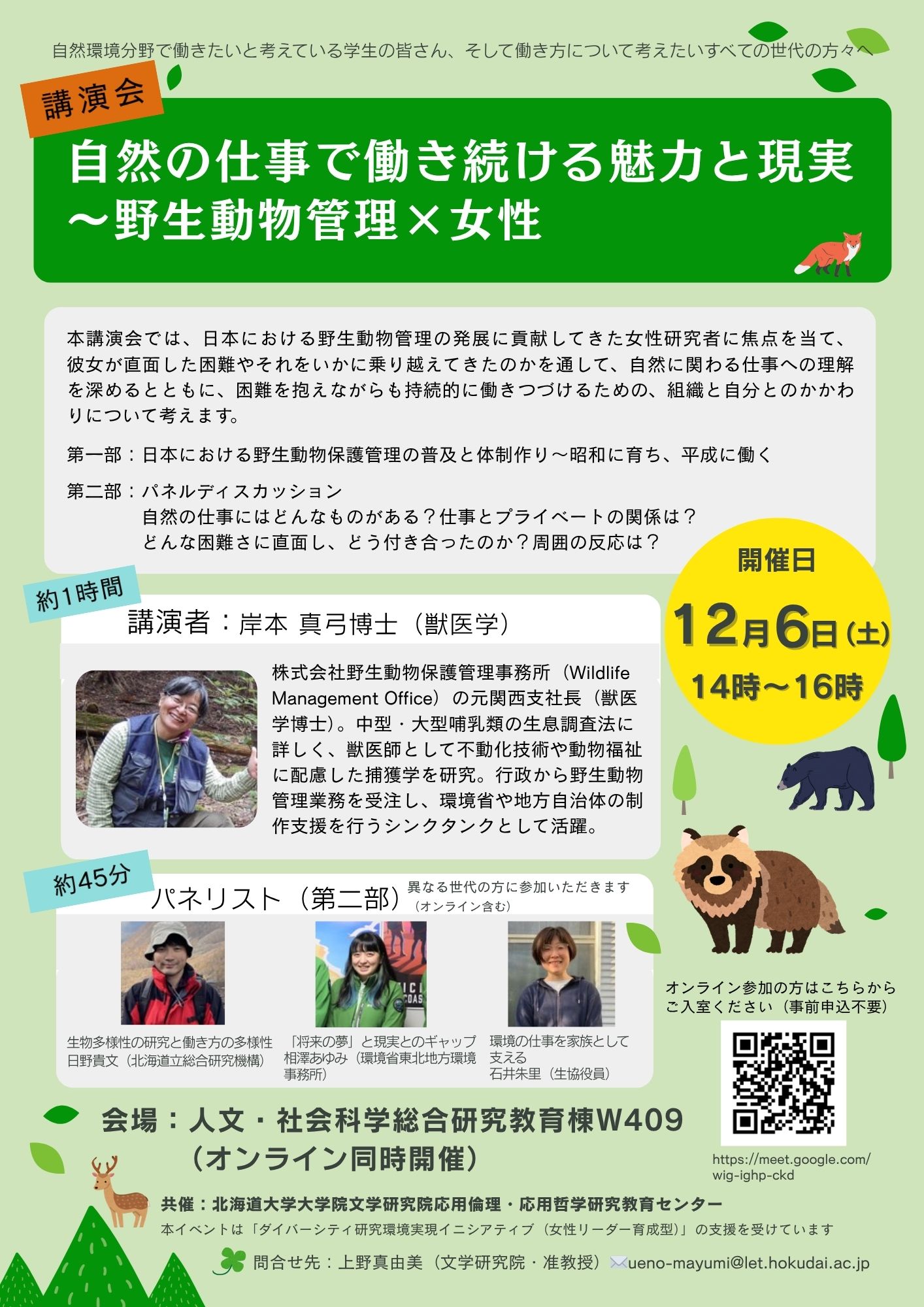 本講演会では、日本における野生動物管理の発展に貢献してきた女性研究者に焦点を当て、 彼女が直面した困難やそれをいかに乗り越えてきたのかを通して、自然に関わる仕事への理解を深めるとともに、困難を抱えながらも持続的に働きつづけるための、組織と自分とのかかわりについて考えます。 - 講演: